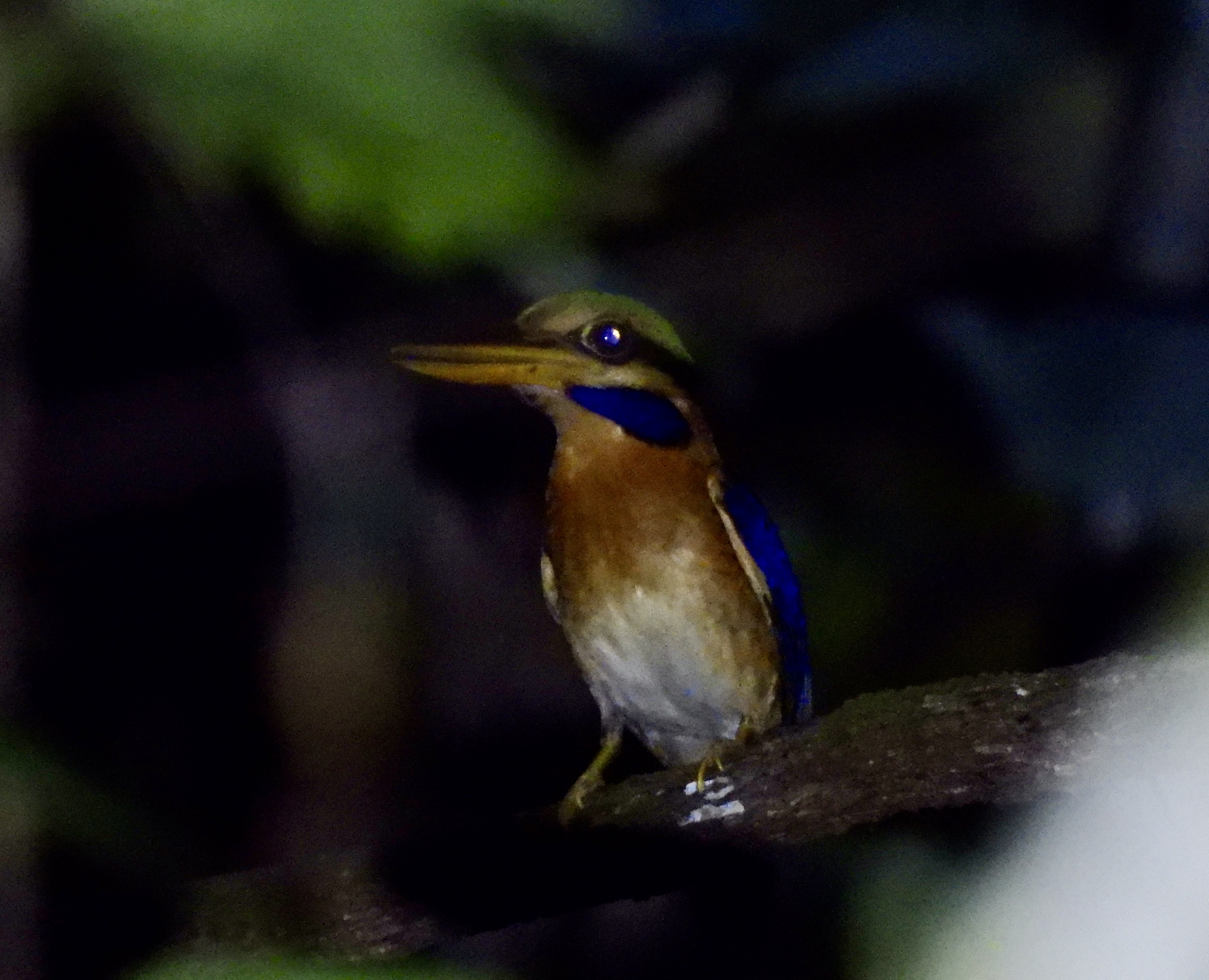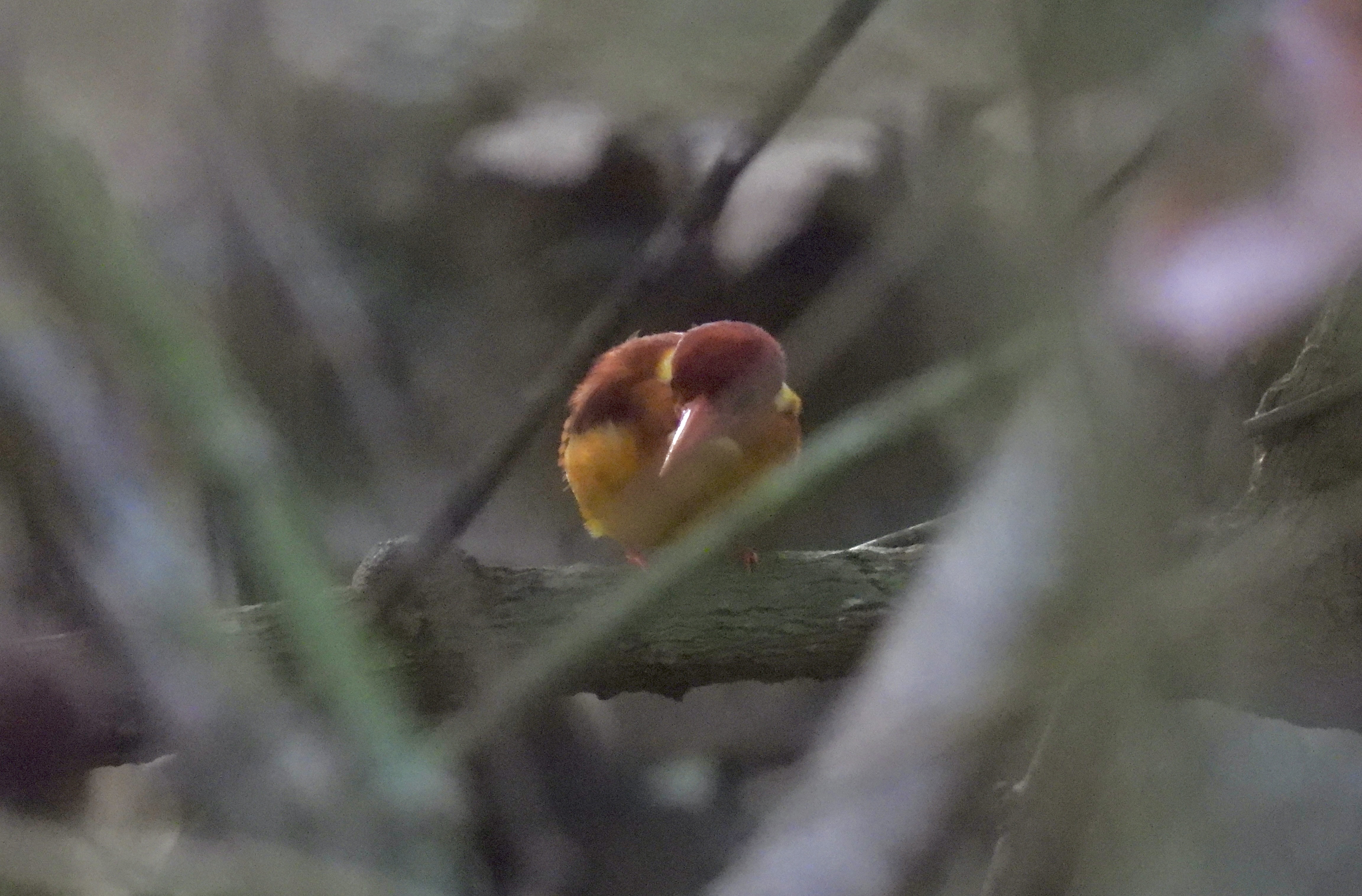 Rufous-backed Dwarf Kingfisher– Brightly-colored species; fast-moving but hard to miss. Got a nice, but somewhat concealed view of one in the forest off the Lower Jeep Track just before sunset on Day 3.