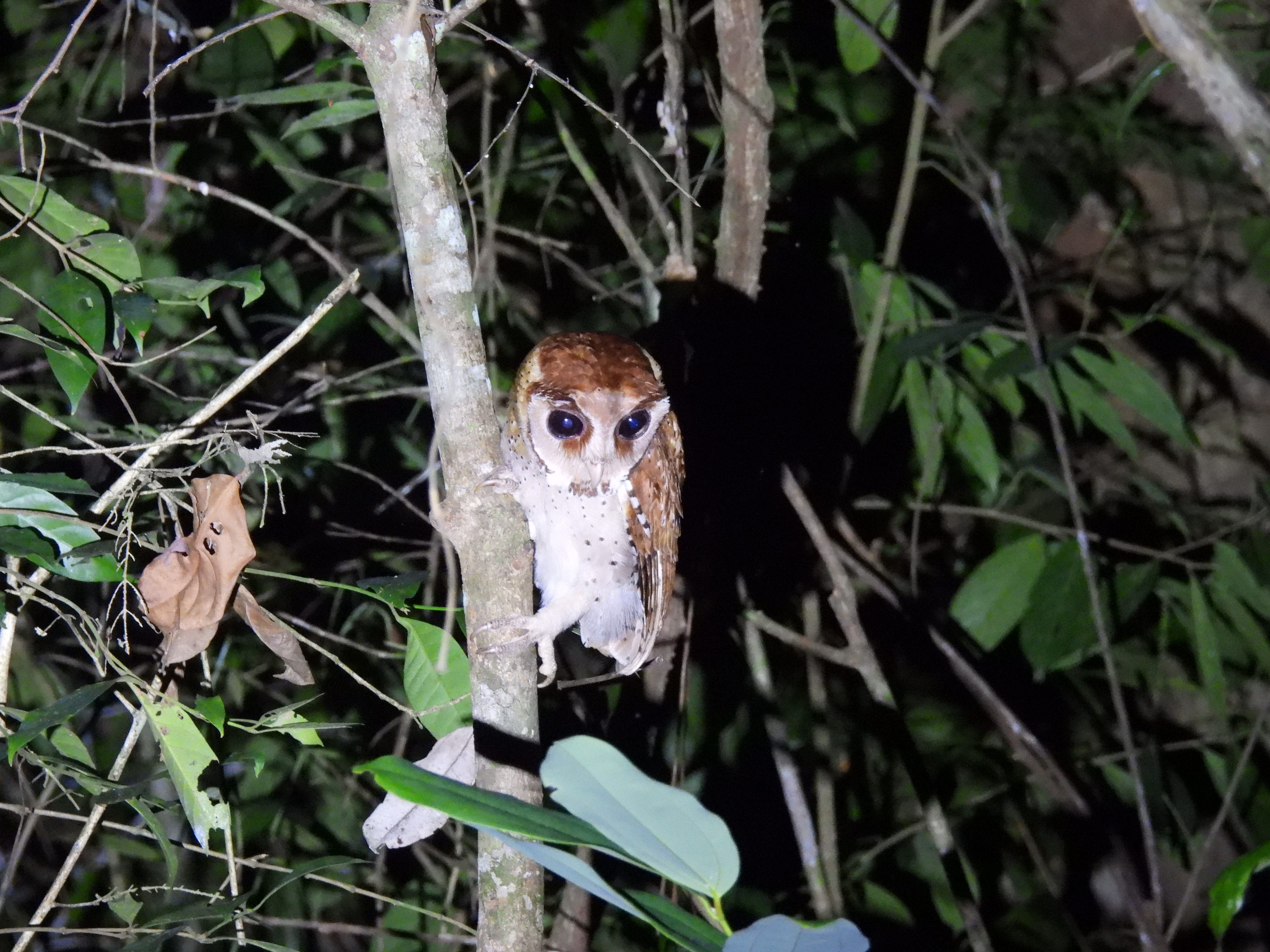 Hari played Oriental Bay Owl songs on his portable speaker for a good portion of our Day 1 and Day 2 night walks to try and lure one out of the forest, and finally, on the evening of Day 3, while we sat in the jeep in the pitch-black, he found one on his thermal scope right next to the jeep! He motioned for me to get out of the vehicle quietly, which I did. My heart was racing and my body was flooded with anticipation.