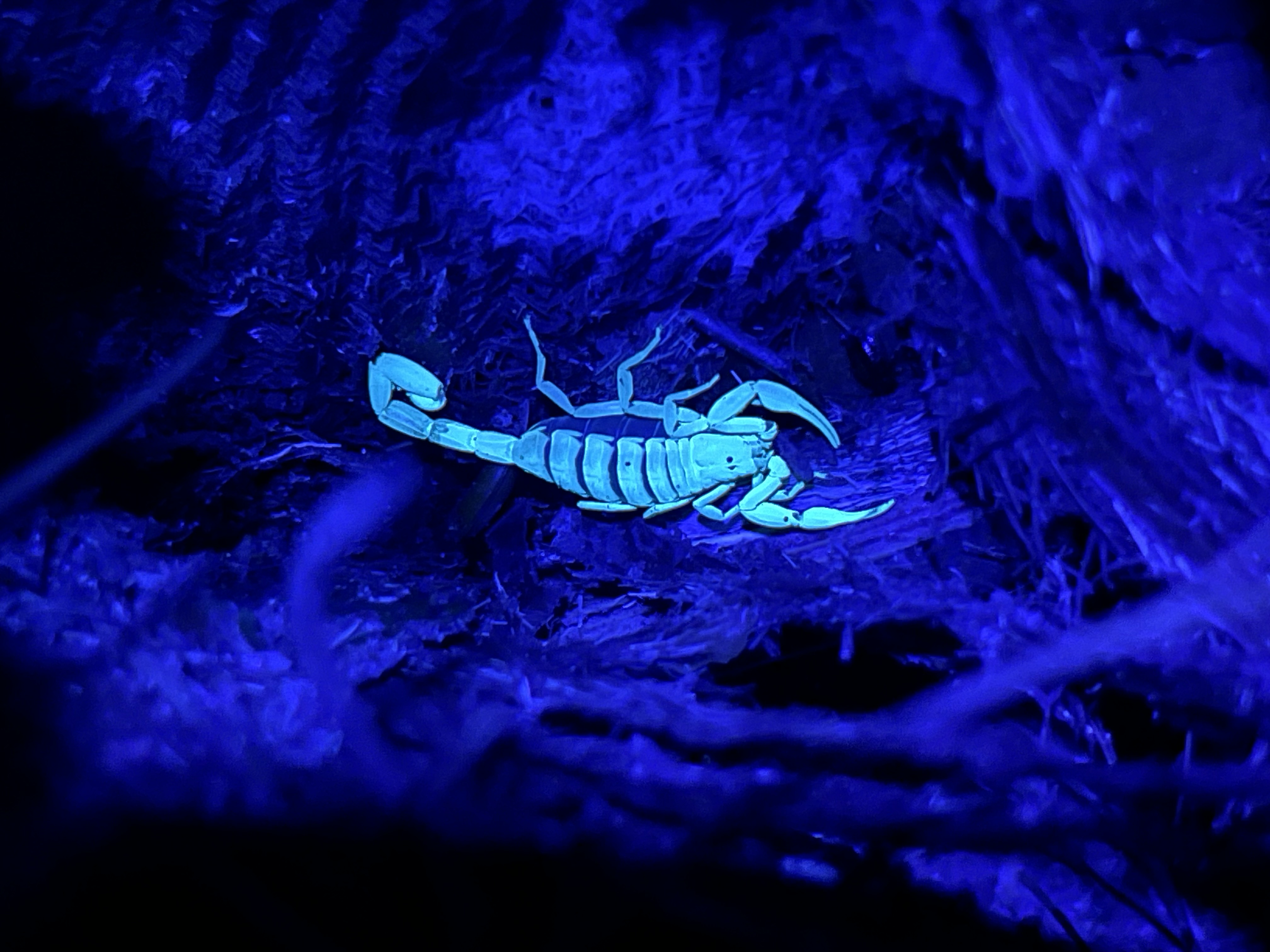 Hentz Striped Scorpion under my blacklight (left) and under a regular flashlight (right)