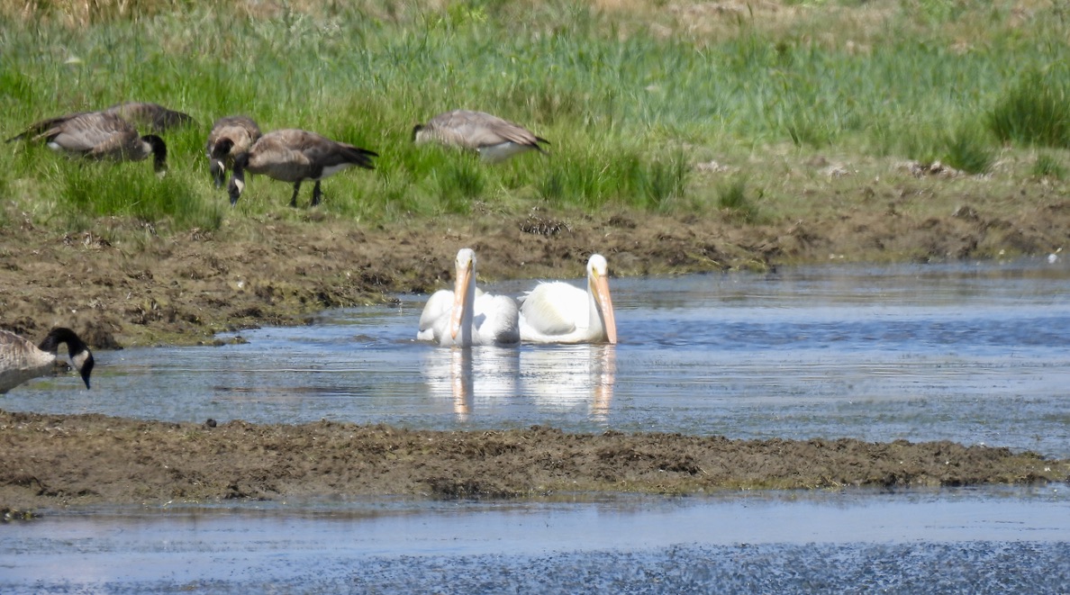 Among the birds I saw were American White Pelicans, American Avocets, White-faced Ibis, Long-billed Dowitchers, Mallards, Gadwalls, Greater Yellowlegs, Canada Geese, Pied-billed Grebes, Northern Shovelers, Great Blue Herons, and a Swainson’s Hawk.