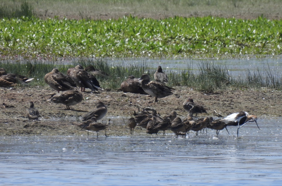Top Row: Gadwalls, Mallards, American Avocets & Long-billed Dowitchers (left), Pied-billed Grebes (top right), and juvenile American Avocet (bottom right)