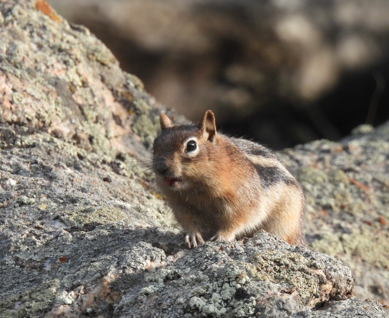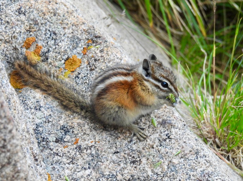 By the time my mom and I had completed the Tundra Communities Trail, our hands were ice-cold and the chilly winds had penetrated our pants and fleeces. It was now around 7:00 PM, and the sky was darkening quickly. We headed back down Trail Ridge Road toward Estes Park, and along the way made a couple stops. Our first stop was at the stunning Forest Canyon Overlook (see the photo at the beginning of this post), where I watched two lively Uinta Chipmunks forage for seeds.