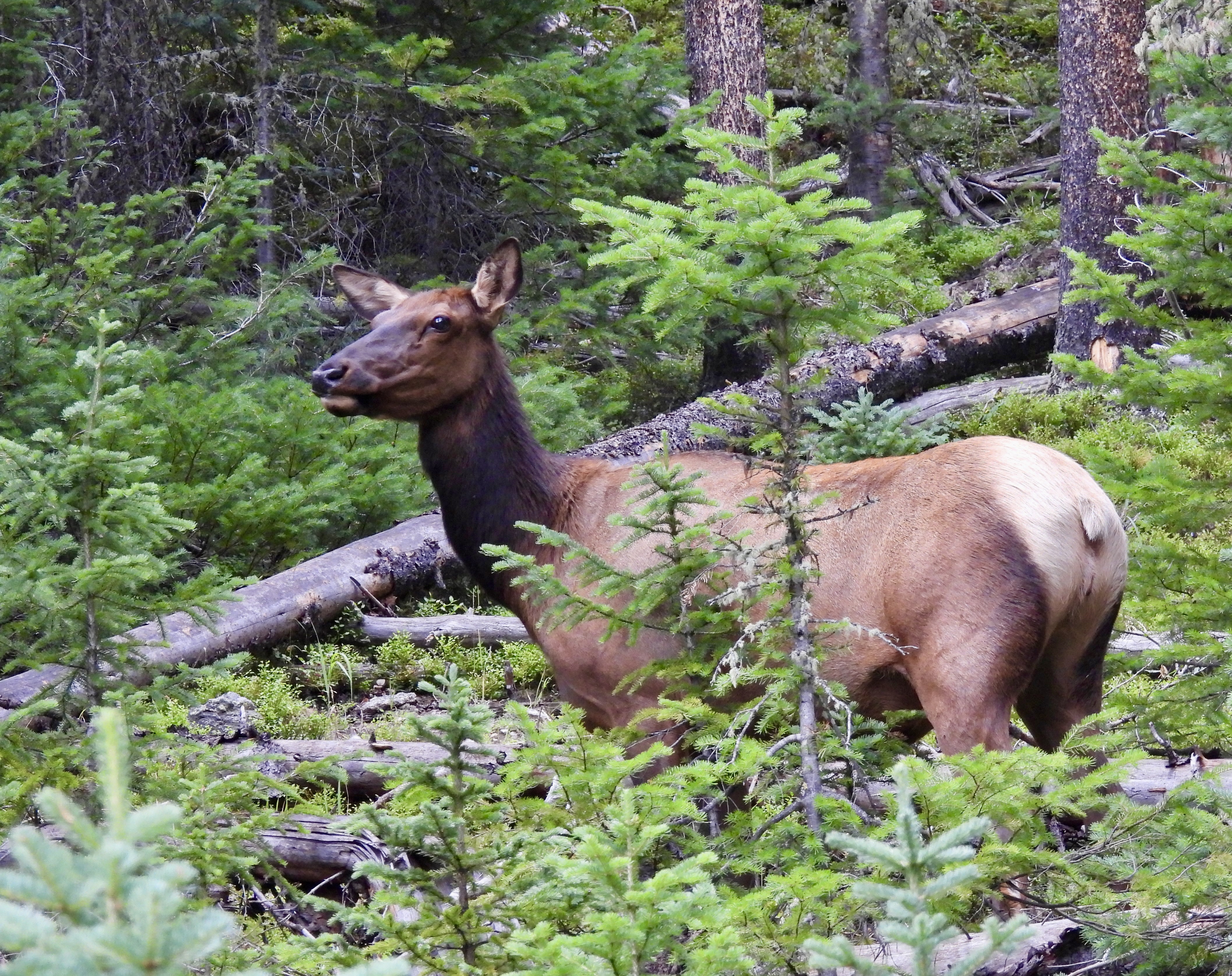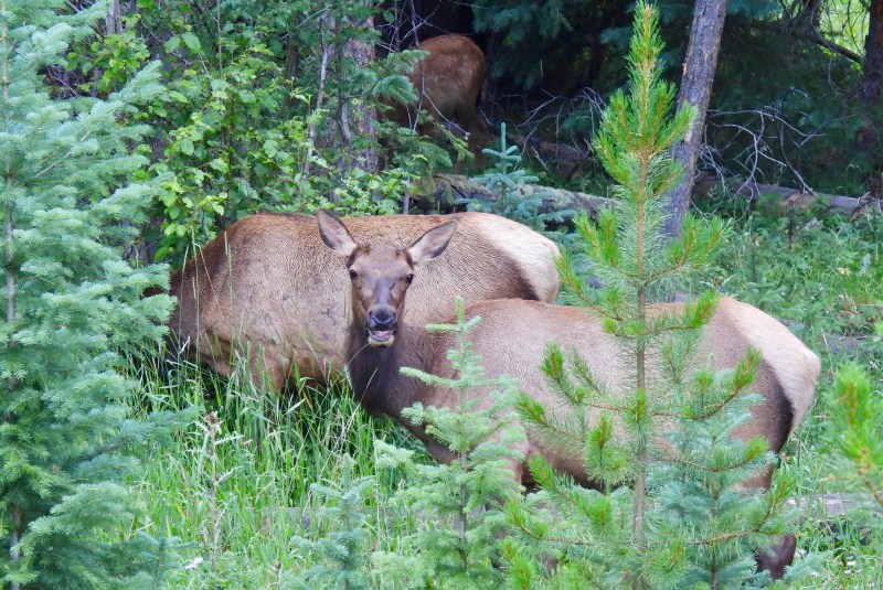 Not far up the road, there was a traffic jam, which meant only one thing—someone had spotted an animal. I got out of the car and walked across the road to a small gully that led into a pine forest. Several groups of people had cameras pointed at something in the shrubbery below, and it took me no time to spot the herd of four Rocky Mountain Elk (Cervus canadensis ssp. nelsoni) cows browsing among the conifers.